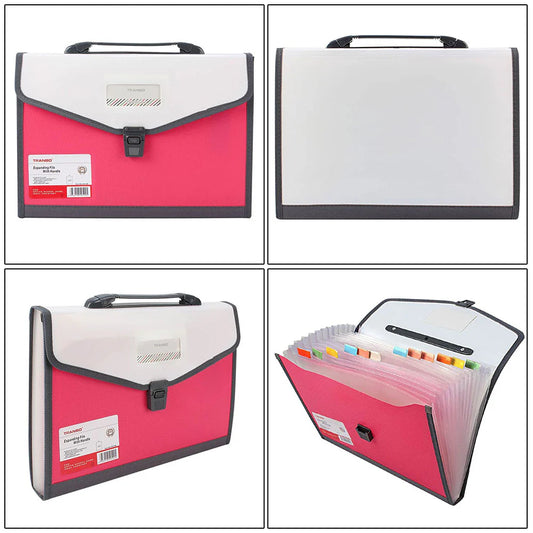 Tranbo Plastic Expanding Bag File Folder With 13 Section Pockets - Pink